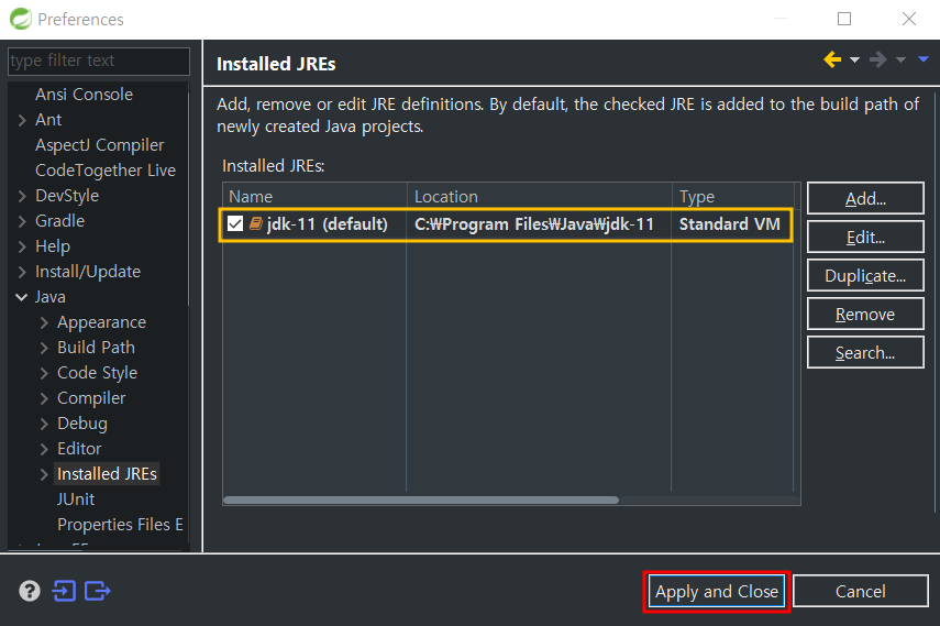 2-3) Installed JREs 탭에서 'jdk-11 (default)'로 바뀐 걸 확인했으면 'Apply and Close'를 클릭