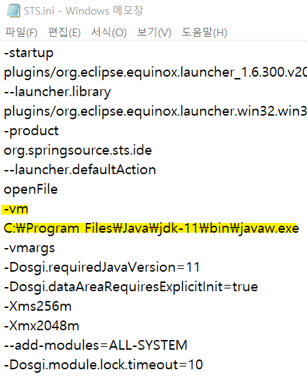 * 지켜져야 할 순서 1) jdk 11설치 2) 이클립스 2021-09 버전 설치(jdk11과 호환이 좋았음) 3) .ini 파일 최상단에 아래 명령 추가(자기가 설치한 jdk 버전과 맞게 입력해줘야 함) - 이거 안해주면 exe에서 에