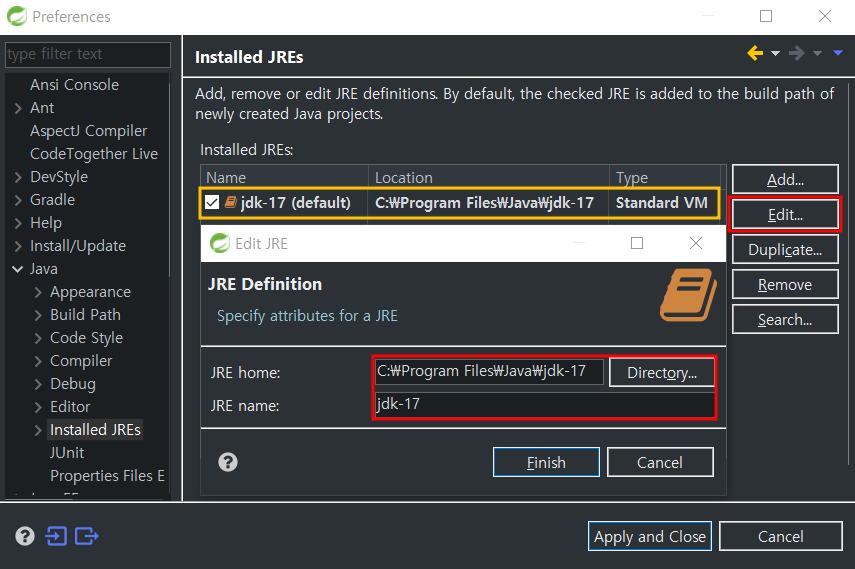 현재 Eclipse에서 JDK 17 버전을 사용했어서 JDK 17로 설정되어 있는 것을