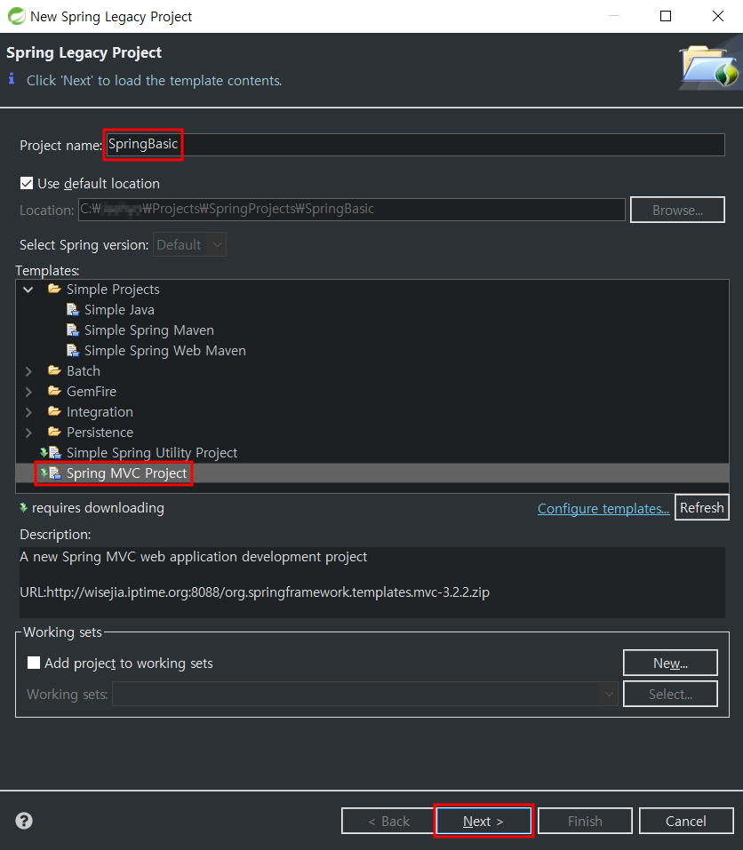 3-2) Project name 입력 ➜ Templates에서 'Spring MVC Project' 선택 ➜ Next